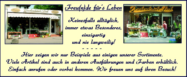 In eigener Sache:Lieber Internetbesucher,auf dieser Seite fanden Sie bisher Marken-namen und Labels unserer Artikel.Es ist sehr zeitaufwendig und kosten-intensiv, durch Reisen, Messebesuchenund sonstigen Recherchen ein für Sieansprechendes Artikelsortiment zusammenzu stellen.Künftig werden wir Namen und Labels hiernicht mehr veröffentlichen, da wir immerwieder feststellen mussten, dass neueArtikel - kurz nach Erscheinen auf unsererInternetseite - auch von Mitbewerbernangeboten werden.Wir bitten Sie hierfür um Verständnis.Natürlich finden Sie in unseren Ladenlokalenneben den bekannten Produkten ständigneue Marken und Artikel.Ihr Team der Geschenkstube Look